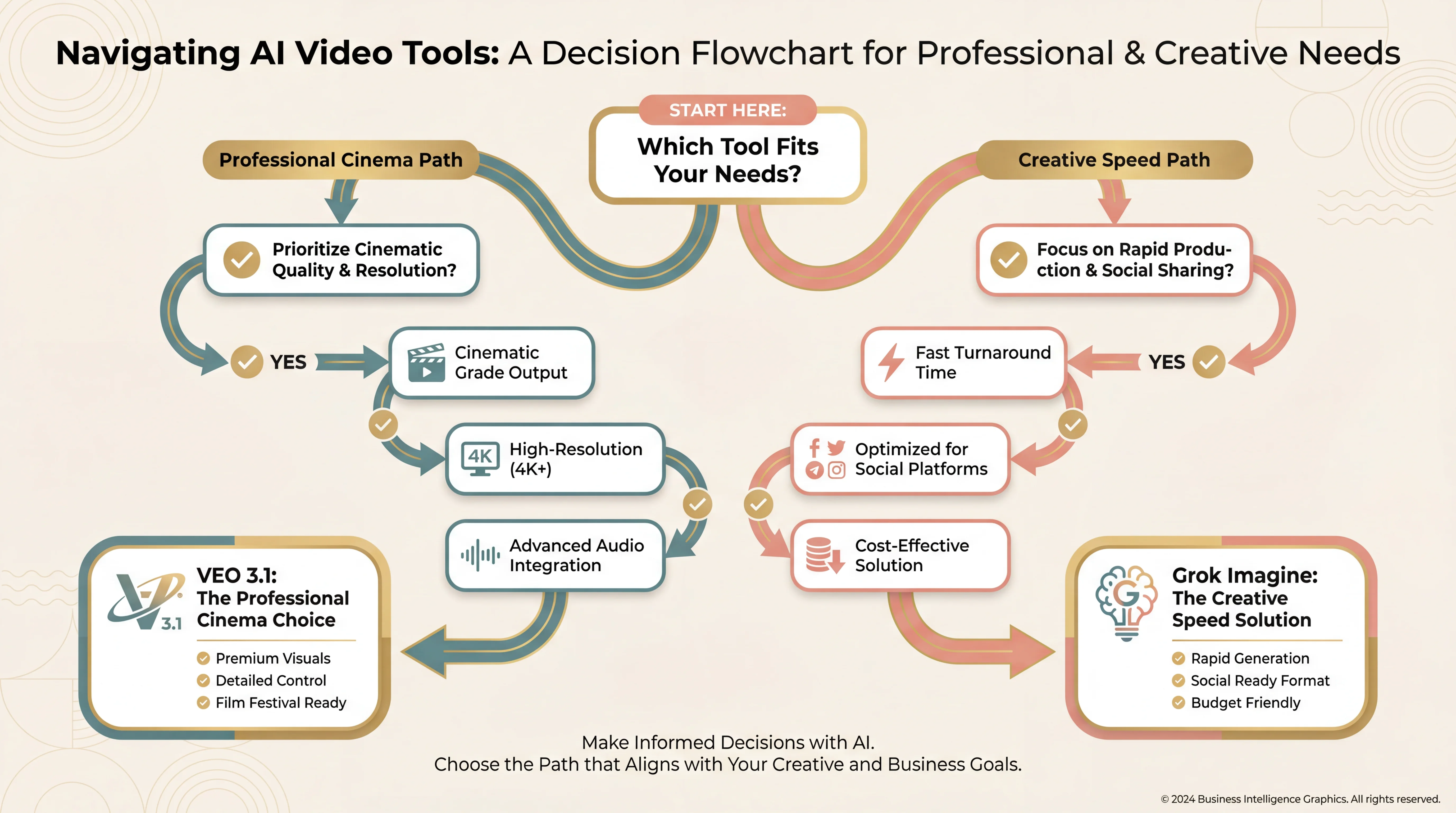 A escolha ideal entre o VEO 3.1 e o Grok Imagine depende inteiramente do seu caso de uso específico, requisitos técnicos e prioridades criativas. Este framework de decisão ajuda a identificar qual modelo se alinha às suas necessidades.